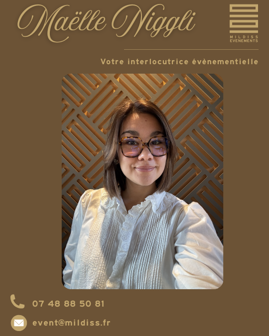N’hésitez pas à contacter Maëlle NIGGLI, votre interlocutrice évènementielle dédiée via notre formulaire de contact ou par mail à event@mildiss.fr ou encore par téléphone au 04 73 79 10 10 ou au 07 48 88 50 81